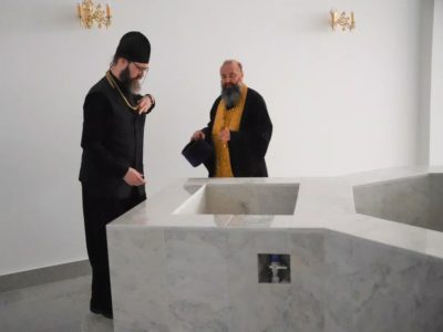 Высокопреосвященнейший владыка посетил храм св. Георгия Победоносца Патриаршего подворья в Зеленограде, здесь он осмотрел убранство храма, алтарь. Особое внимание обратил на иконостас, отметил некоторые иконы. Затем осмотрел нижний крестильный храм, где идет подготовка к началу эксплуатации Купели.