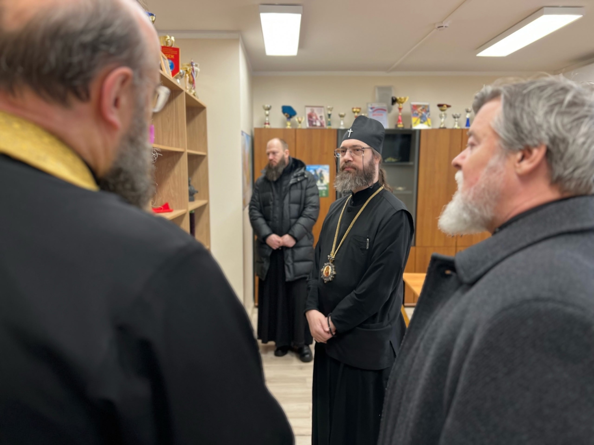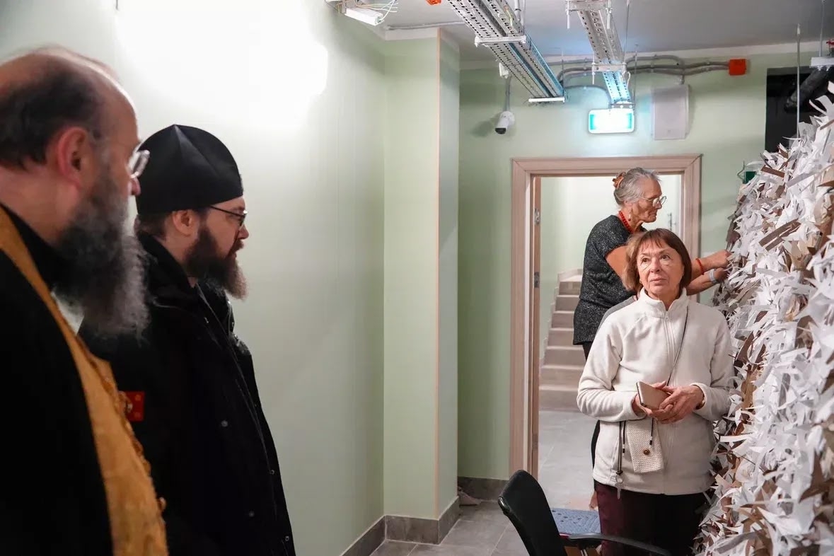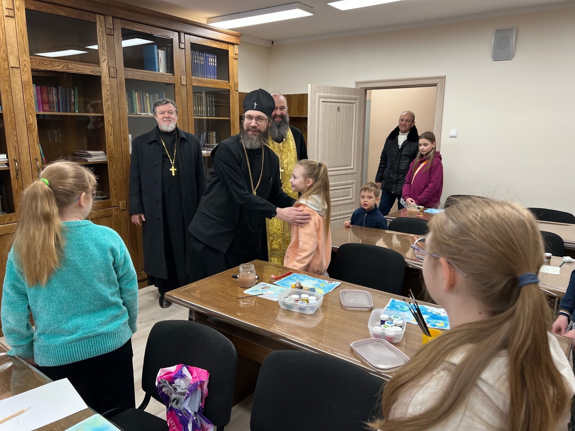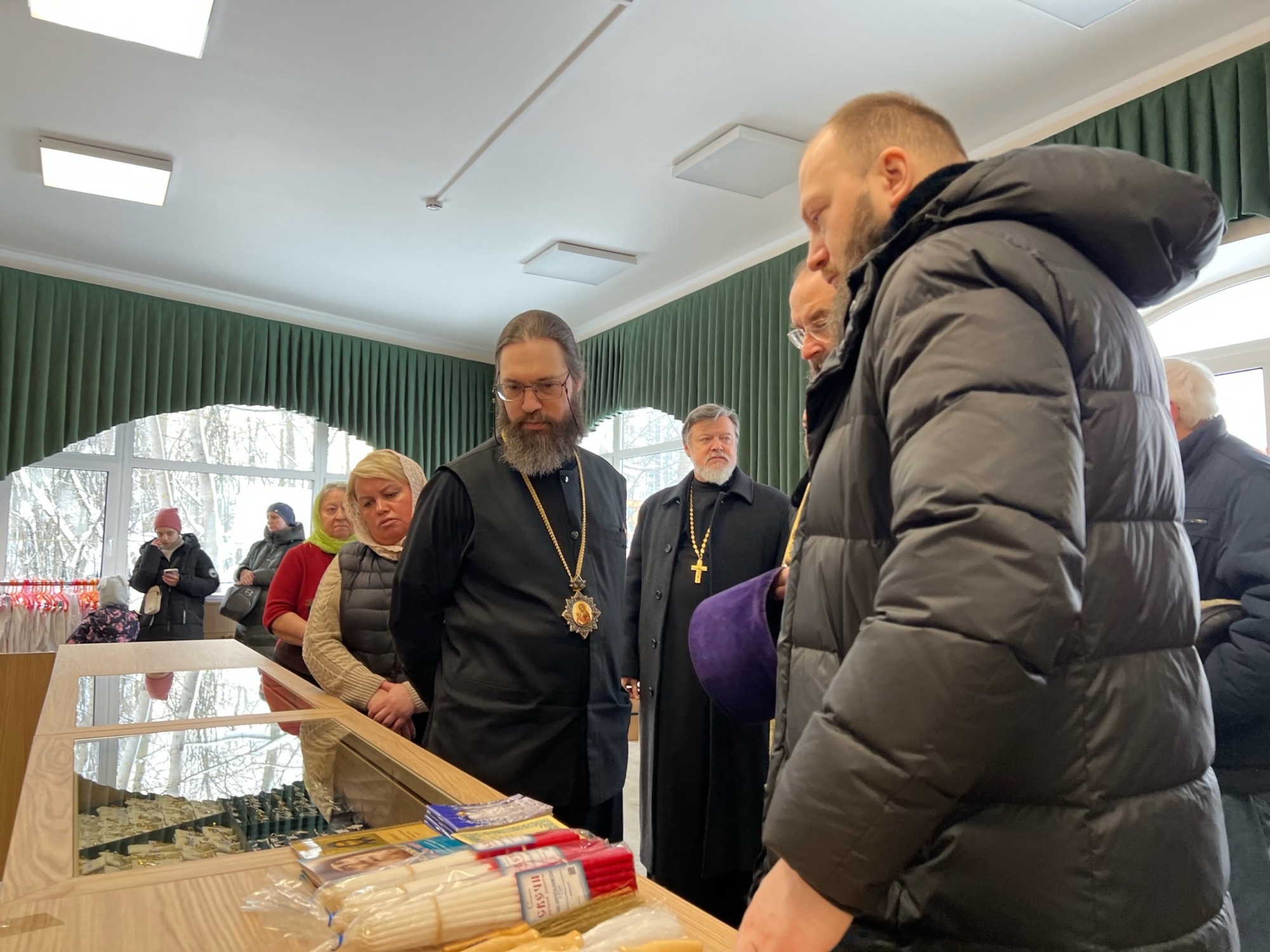 Владыка прошёл в Дом причта и ознакомился с приходской деятельностью: пообщался с волонтёрами, плетущими маскировочные сети для СВО, с воспитанниками Воскресной школы, осмотрел классы и залы. Посмотрел библиотеку, иконную лавку, поднялся на звонницу храма и зашëл на клирос. Везде сопровождающие старались дать владыке интересный подробный комментарий.